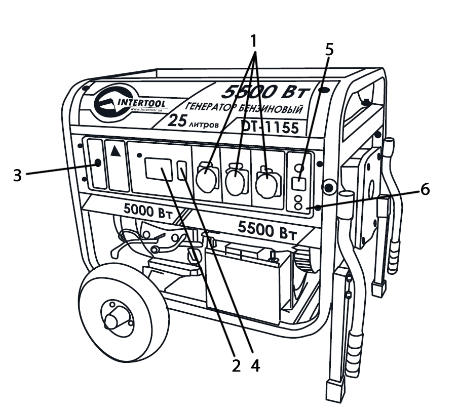 Характеристики Генератор бензиновый Intertool 5.5 кВт., 13 л.с., 4-х тактный (DT-1155)