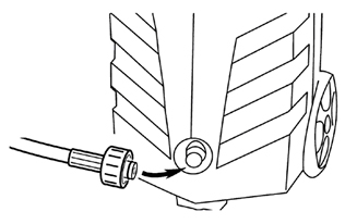 3) Подсоедините шланг высокого давления к разъему на передней панели мойки. Перед соединением извлеките пластиковую пробку, вставленную для безопасности. Плотно прикрутите шланг (вручную) во избежание протекания.