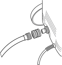 4) Подсоедините быстроразъемное соединение к мойке. Перед соединением извлеките пластиковую пробку. После того, как оба компонента установлены, подсоедините поливочный шланг к соединителю, который соединен к мойке — вставьте насадку шланга в штуцер на мойке. Соедините шланг с водопроводом.