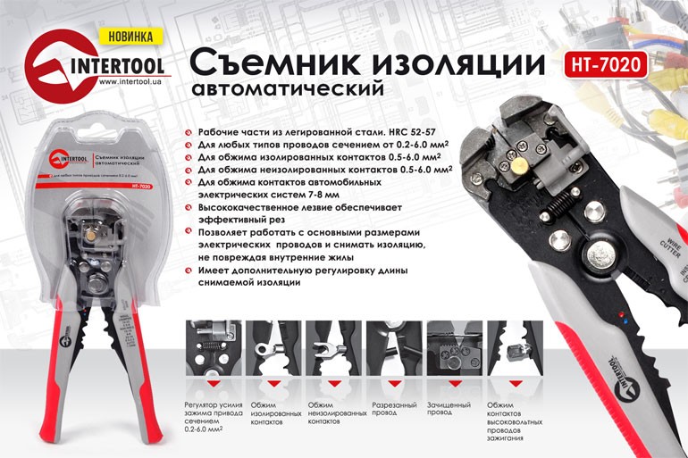 Автоматический съемник изоляции INTERTOOL HT-7020 — это надежный инструмент, который повышает скорость, качество и удобство электромонтажных работ.